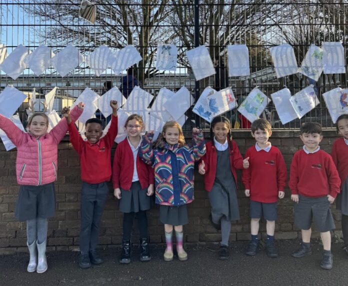 The display, physically hung along the school fences on Musters Road, was installed by the children as a community act on the final day of term. It will remain in place until 28th December for all to enjoy.