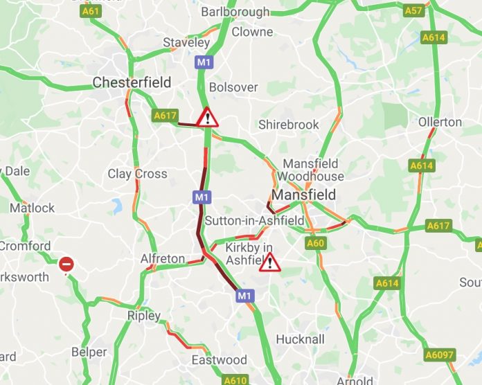 ‘Two lanes closed and queueing traffic due to multi-vehicle accident on M1 Northbound from J28 A38 (Alfreton / Mansfield) to J29 A617 (Chesterfield / Mansfield).