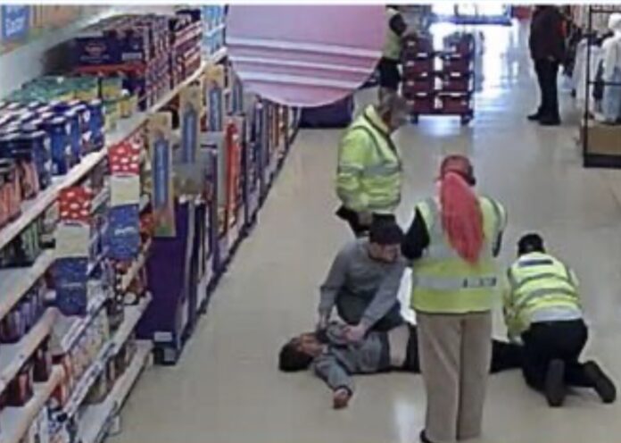 Security staff challenged him as he attempted to leave, at which point he became violent. An off-duty officer, PC Ross Morgan, who was in the store at the time, intervened and assisted staff in restraining Wharmsby until on-duty officers arrived.