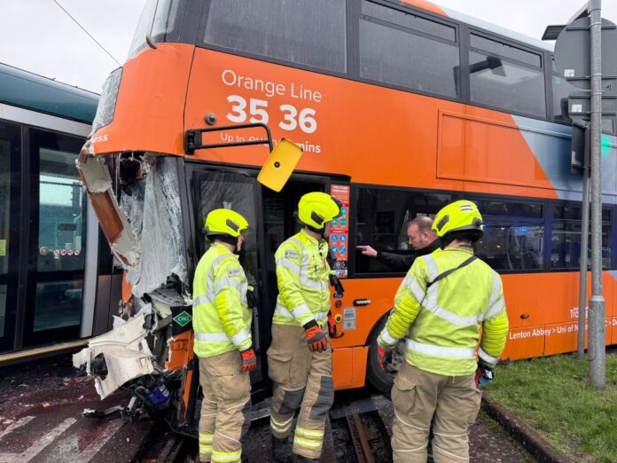 ‘We are currently at the scene of a collision between a tram and a bus in Chilwell.